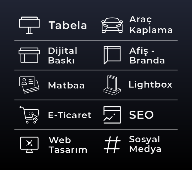 Markanızı dijitalde ve sahada güçlendirmek için buradayız. Web tasarımı, e-ticaret, sosyal medya yönetimi ve SEO gibi dijital çözümlerden; tabela, araç kaplama, dijital baskı ve açık hava reklamlarına kadar geniş hizmet yelpazemizle fark yaratıyoruz.